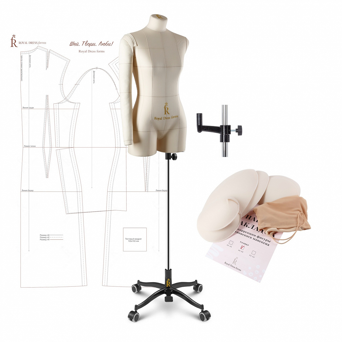 Мягкий портновский манекен Моника в премиальной комплектации из 8 предметов: торс манекена, подставка, фиксатор вращения манекена, правая рука, набор накладок, базовые конструкции, магнит, чехол.Допускается отклонение от указанных размеров на 1,5%.