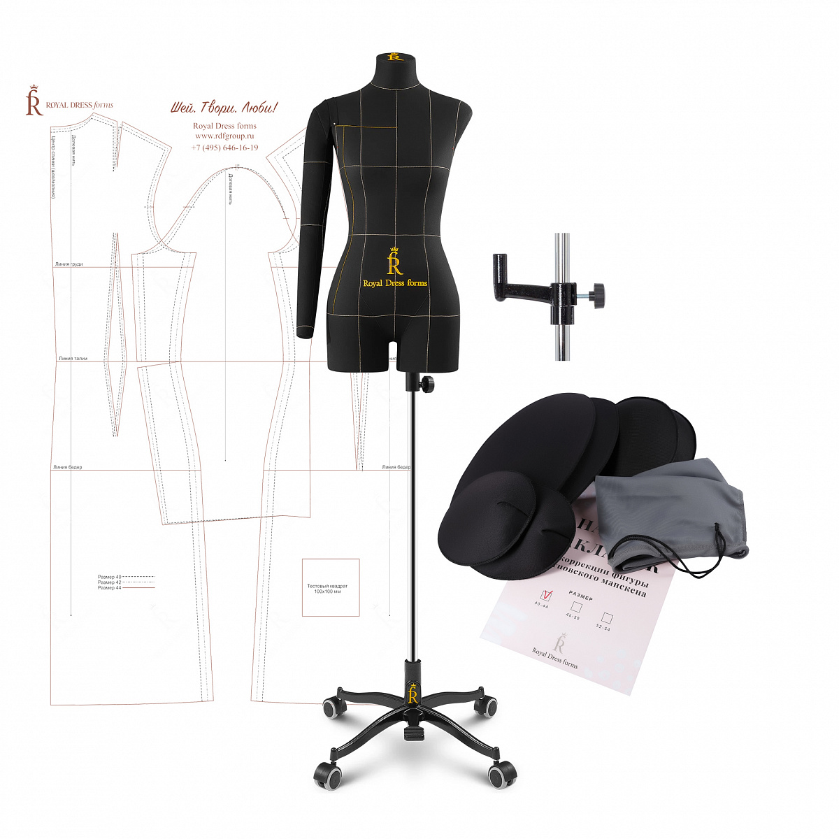 Мягкий портновский манекен Моника в премиальной комплектации из 8 предметов: торс манекена, подставка, фиксатор вращения манекена, правая рука, набор накладок, базовые конструкции, магнит, чехол.Допускается отклонение от указанных размеров на 1,5%.